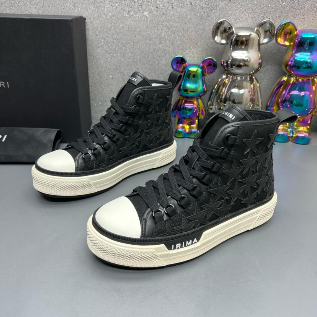 נעלי סניקרס גבוהות שחורות יוקרתיות מבית אמירי, עם עיצוב אייקוני וייחודי: מוטיב "כוכבים" שחור בולט על רקע שחור, המעניק לנעל מראה נועז ומושך את העין. נגיעות לבנות בולטות על הסוליה, מוסיפות טוויסט מודרני ואופנתי. הנעליים עשויות עור איכותי עם פרטים מוקפדים, ומשלבות סטייל אורבני עם אלמנטים יוקרתיים