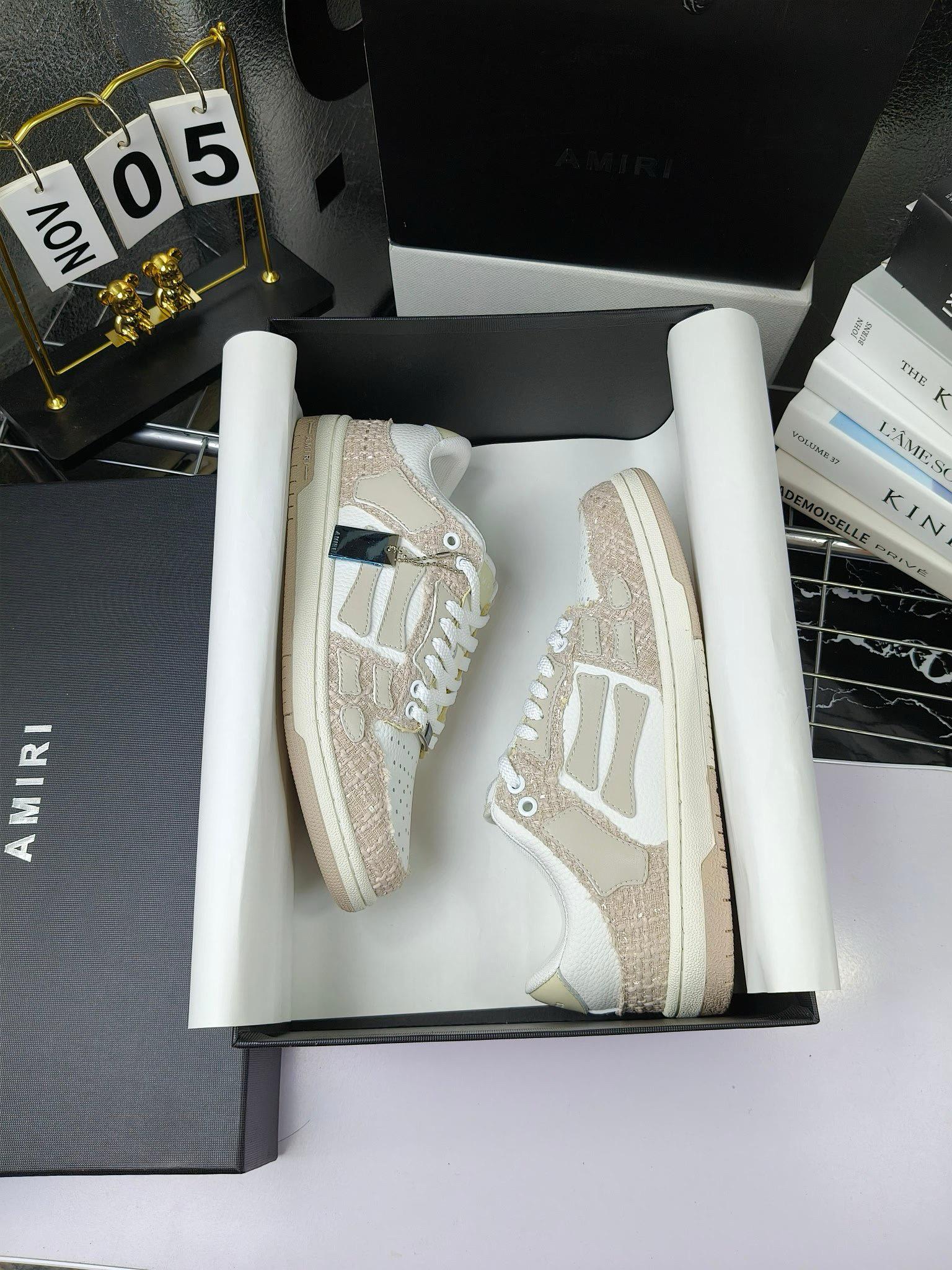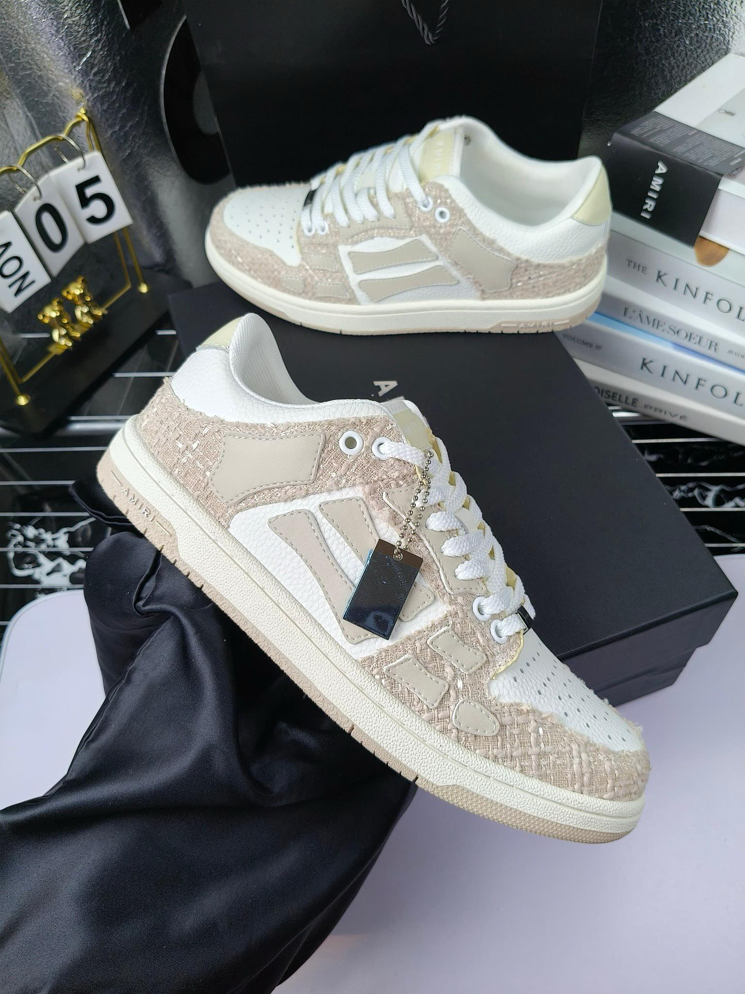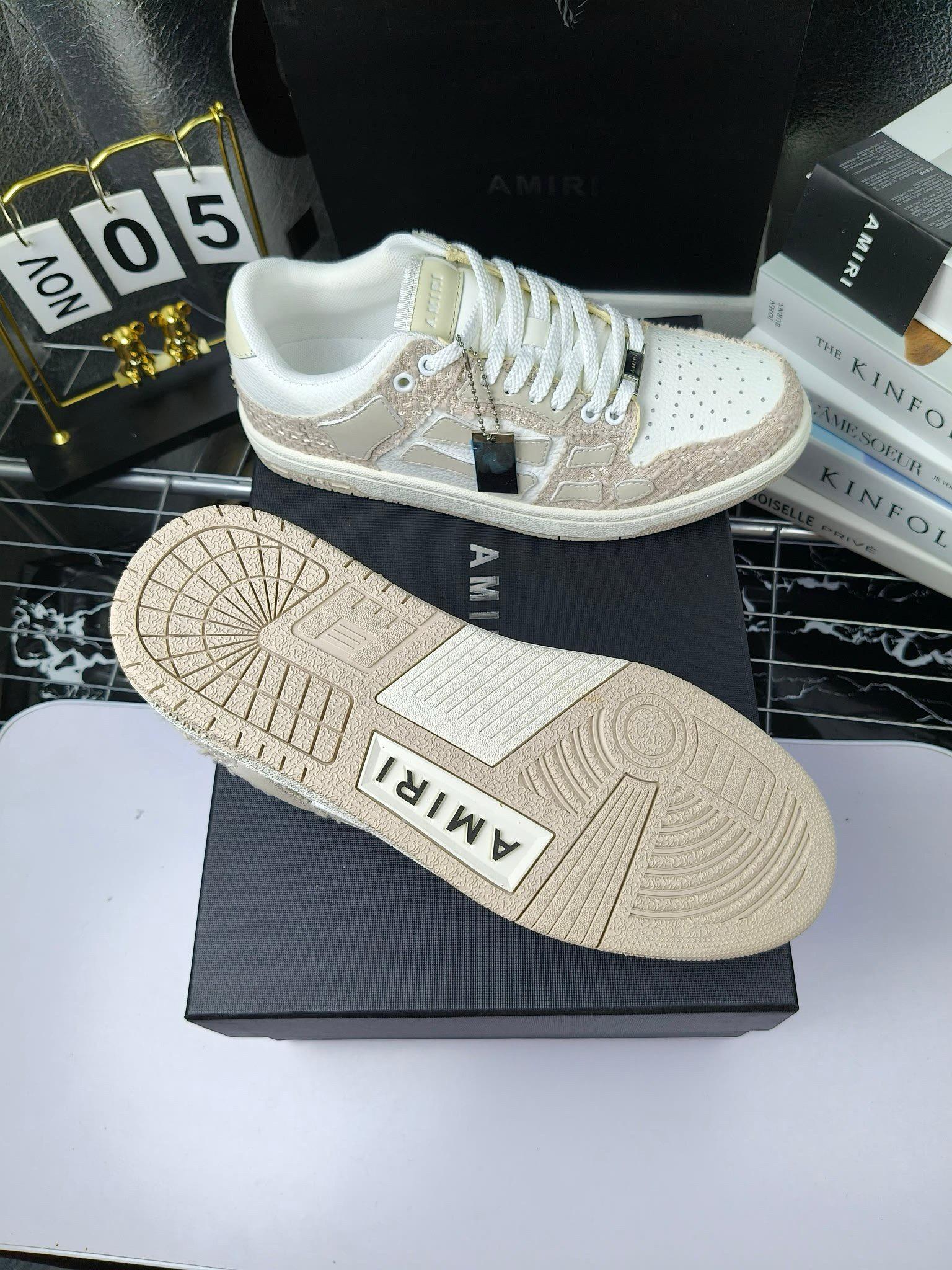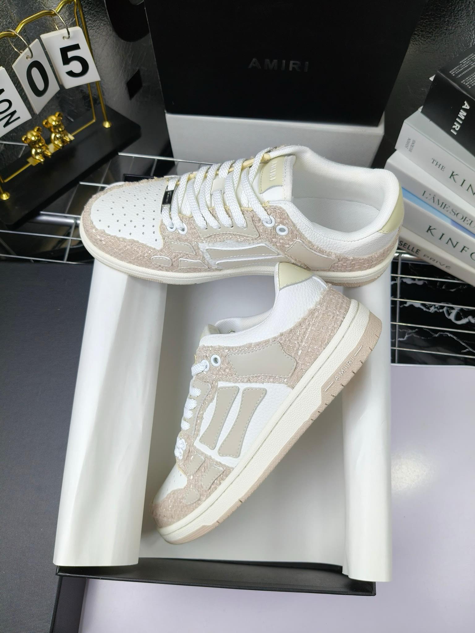 נעלי סניקרס יוקרתיות מבית אמירי, עם עיצוב אייקוני וייחודי: מוטיב "עצמות" בולט על רקע קרם, המעניק לנעל מראה נועז ומושך את העין. גוון הקרם העדין מוסיף טאץ' אלגנטי וייחודי. הנעליים עשויות עור איכותי עם פרטים מוקפדים, ומשלבות סטייל אורבני עם אלמנטים יוקרתיים