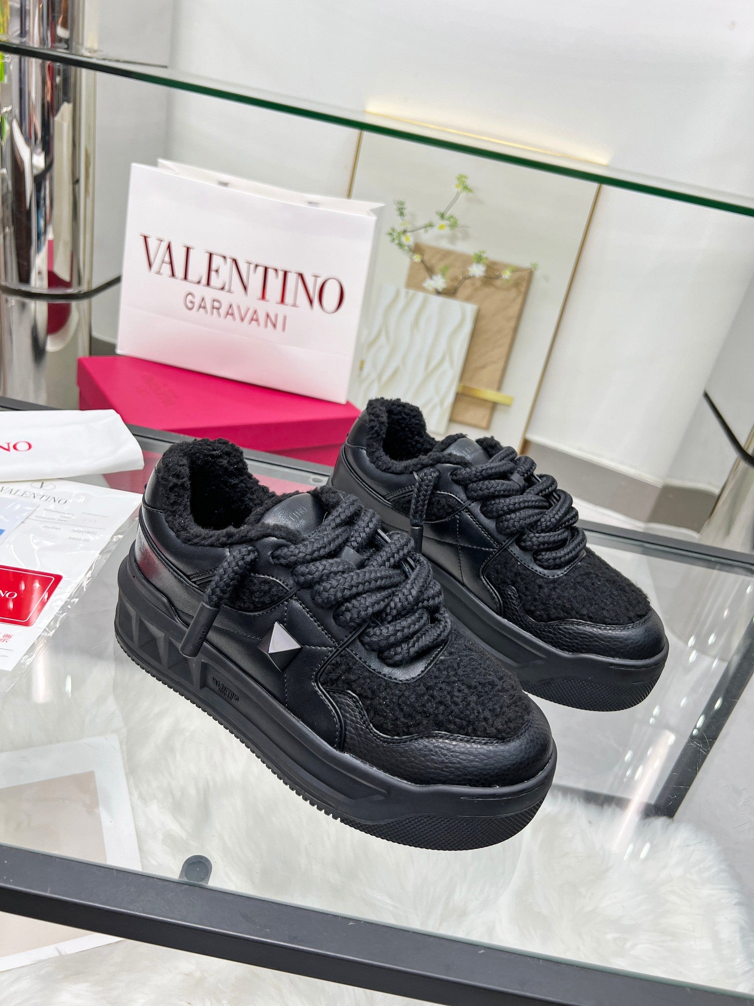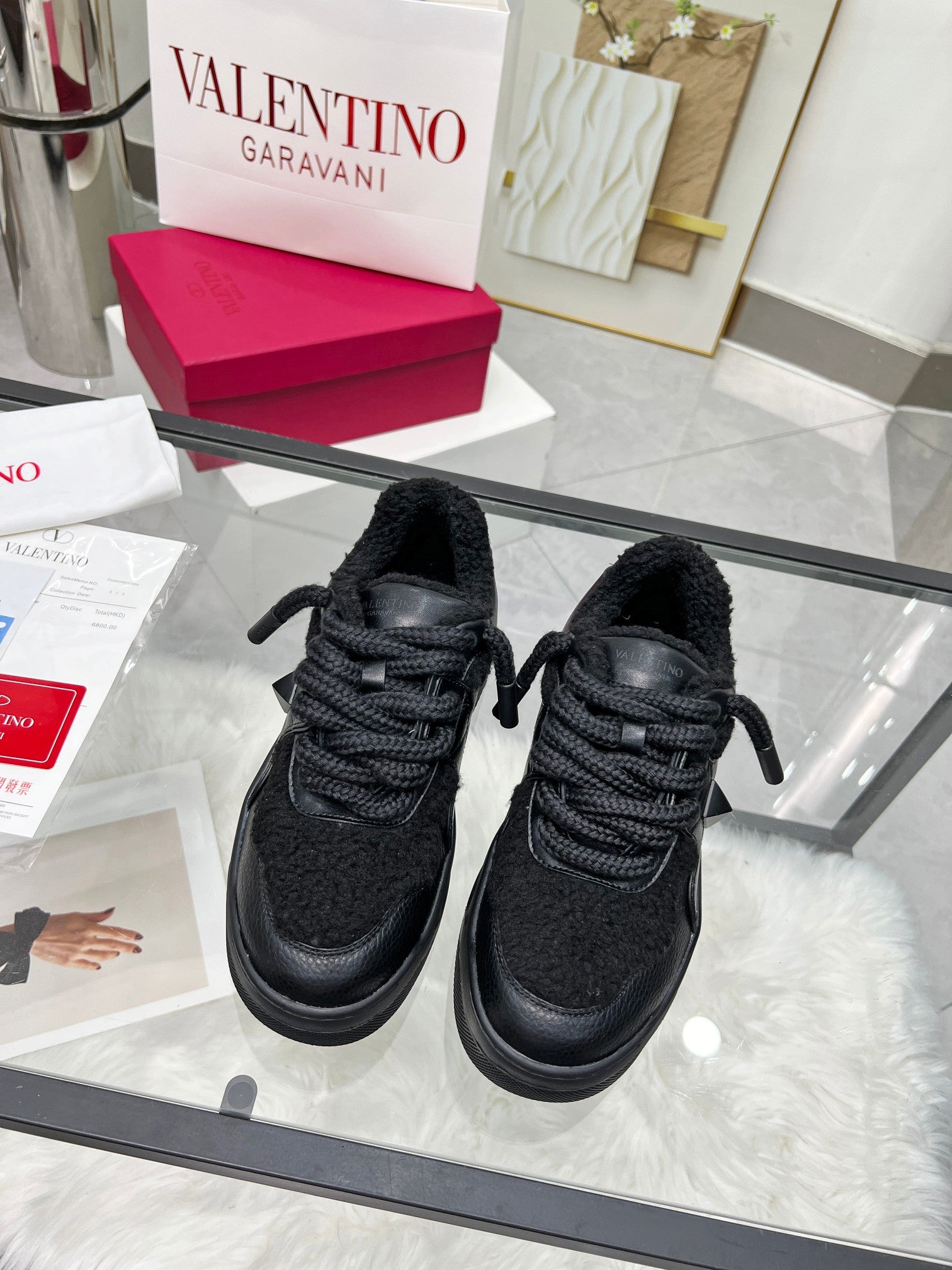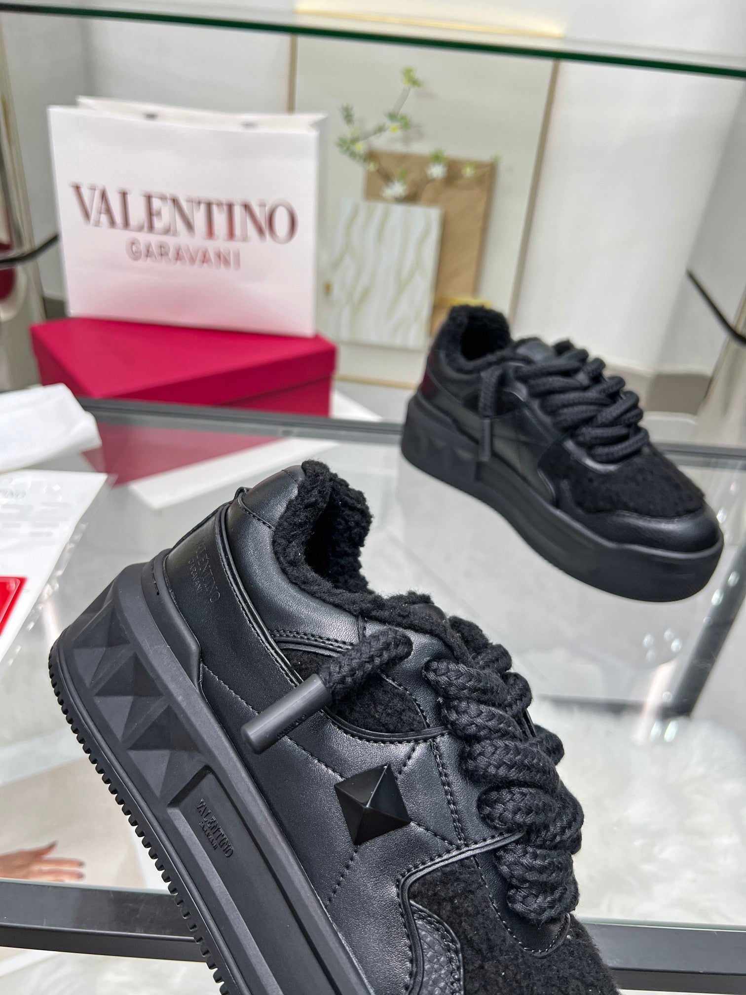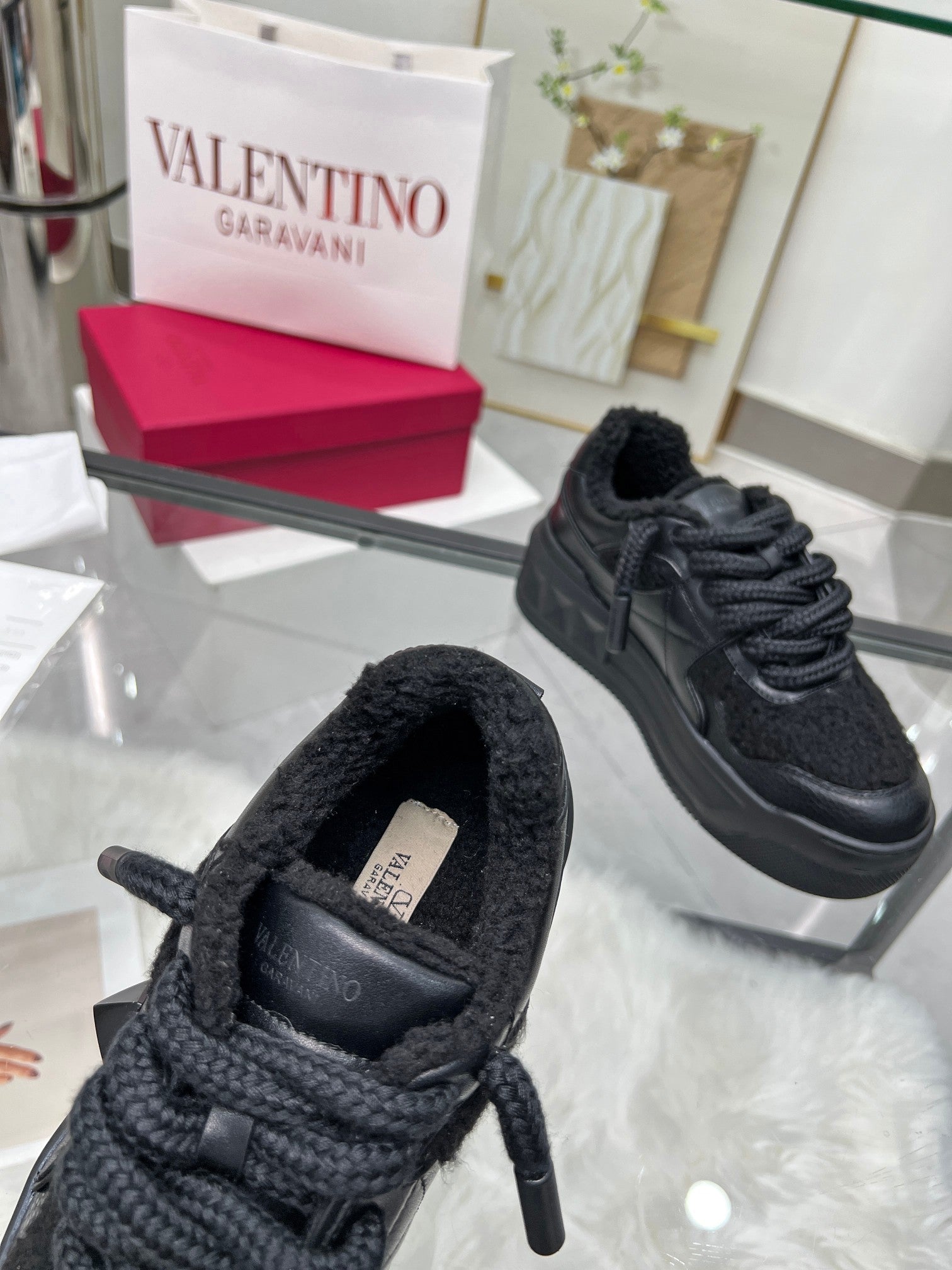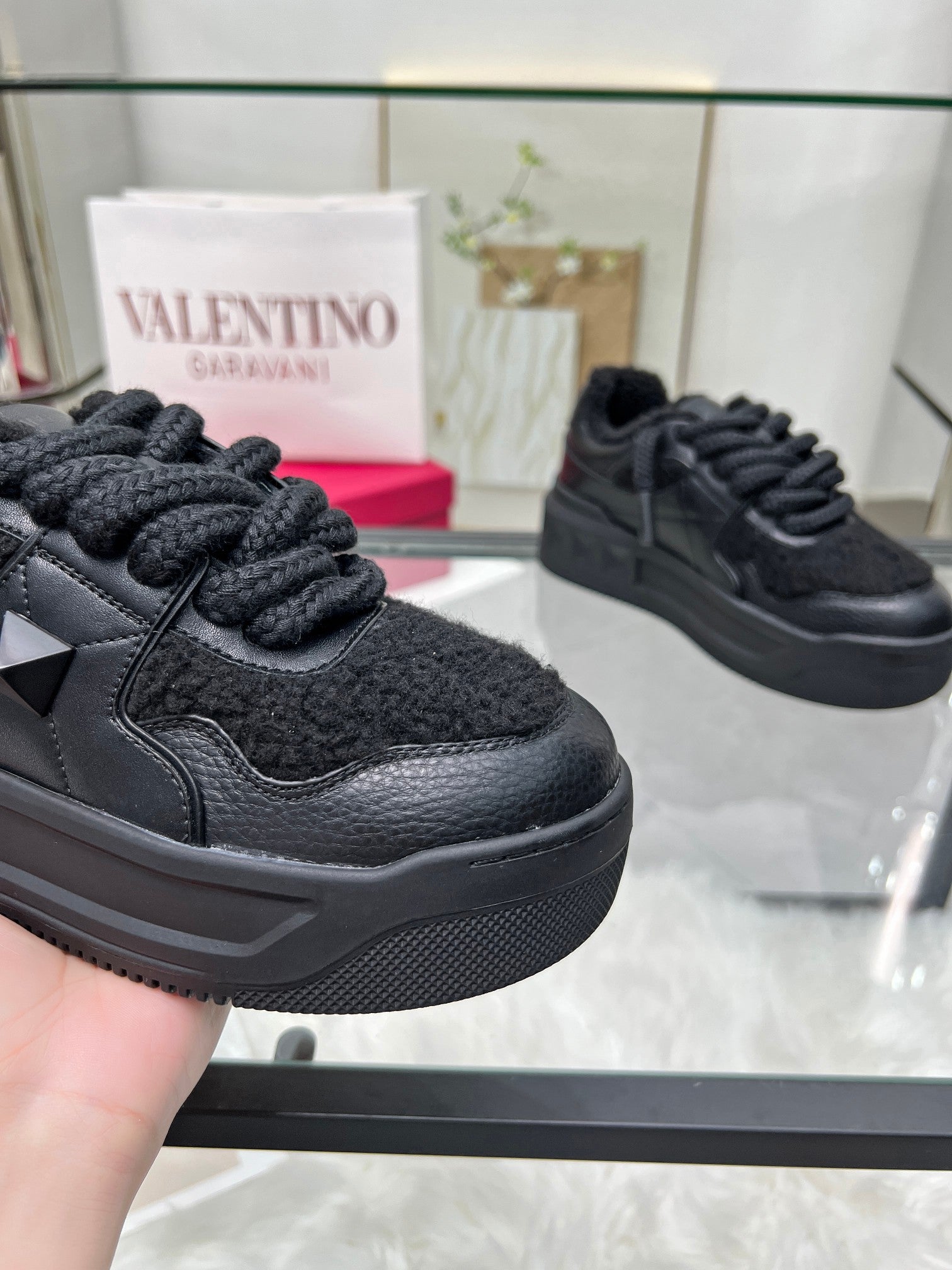 נעלי סניקרס שחורות מט יוקרתיות מבית האופנה ולנטינו, עם טוויסט ייחודי ונועז: חלקן הקדמי והאחורי מעוטר בפרווה שחורה רכה ואיכותית, המעניקה להן מראה חורפי ויוקרתי במיוחד. שאר חלקי הנעל עשויים עור שחור מט, המעניק מראה תחום ומודרני