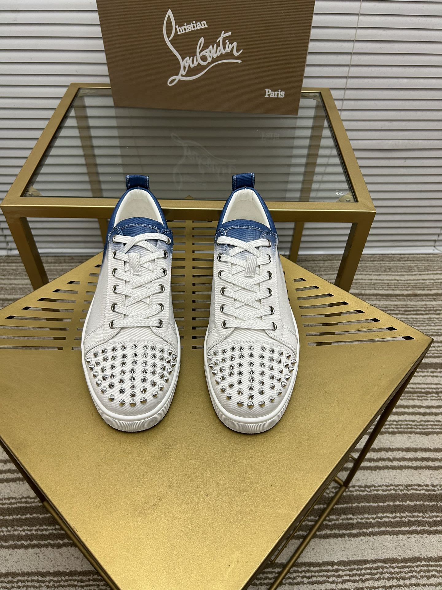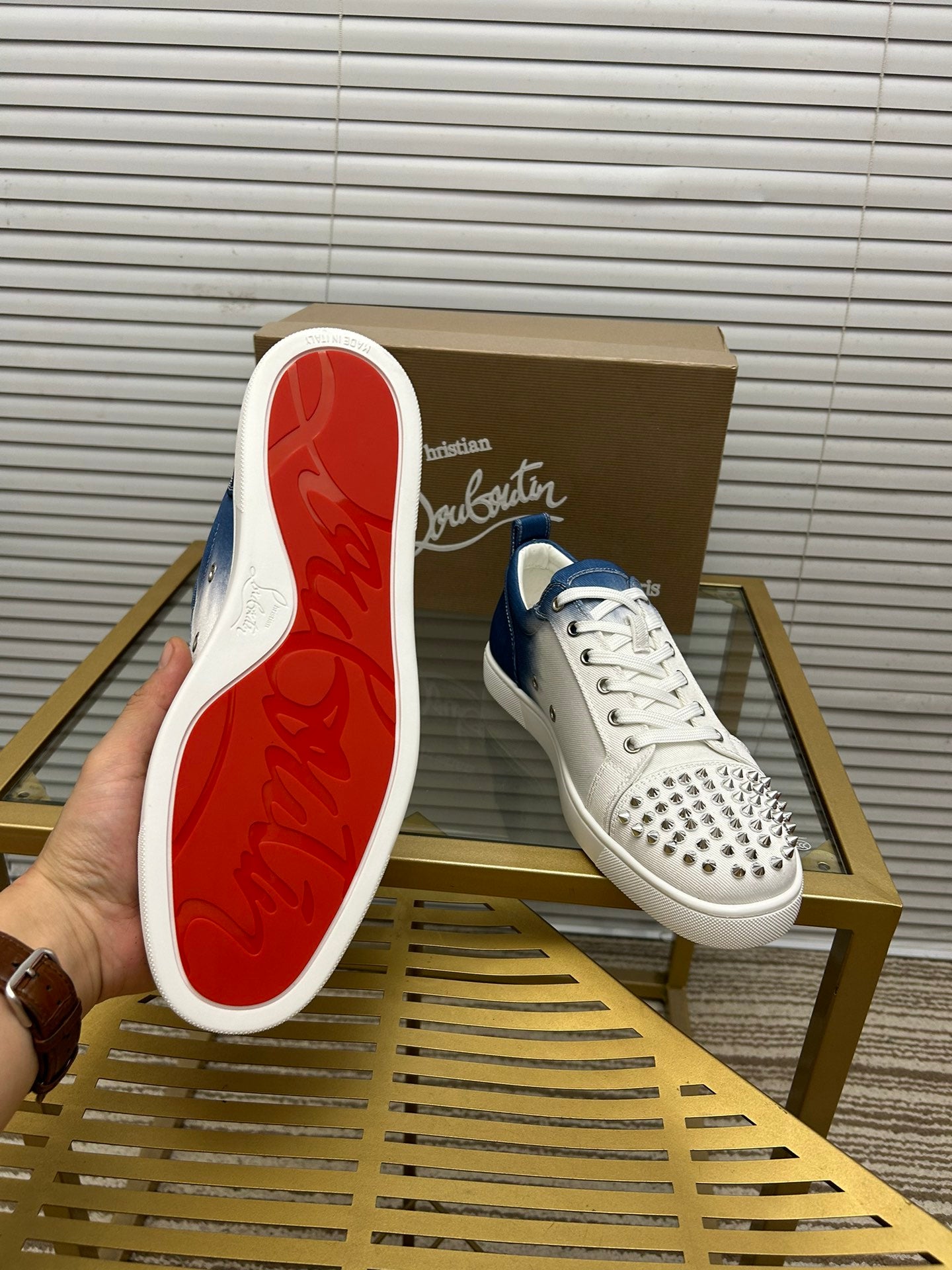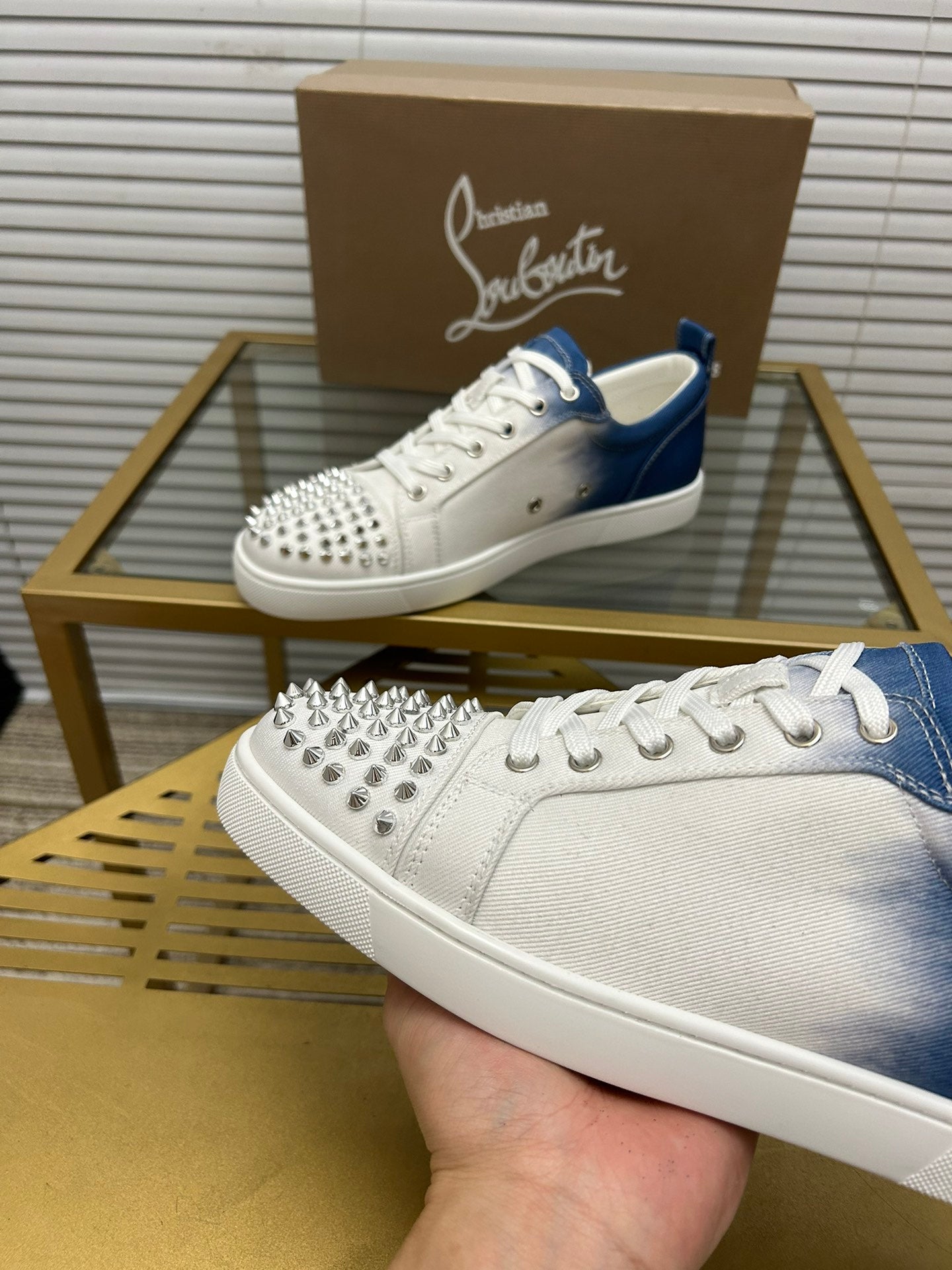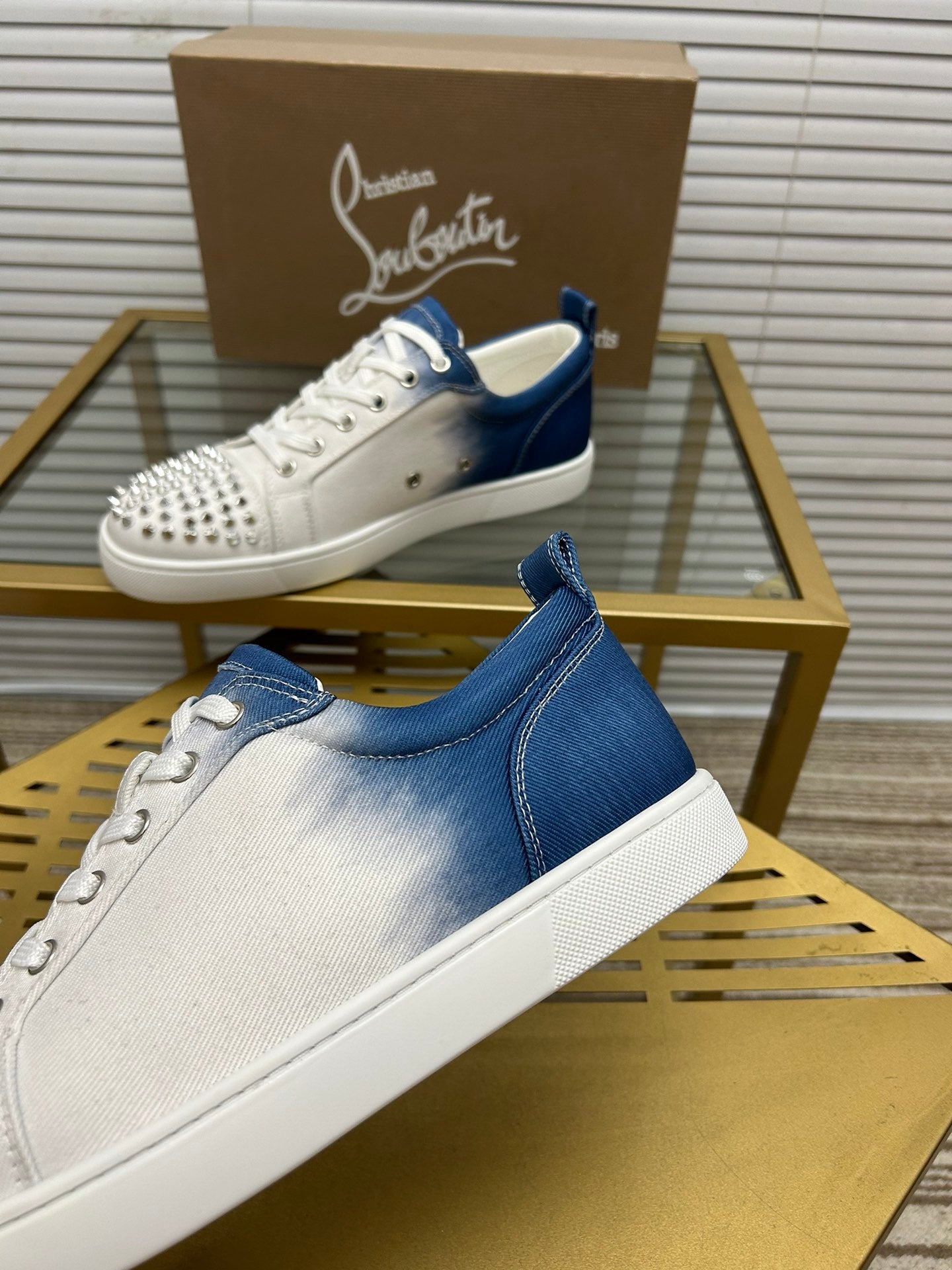 נעלי סניקרס אופנתיות וייחודיות מבית האופנה היוקרתי כריסטיאן לובוטין. נעליים אלו משלבות חומרים וסגנונות שונים: חלקן הקדמי לבן קלאסי, בעוד שחלקן האחורי עשוי מבד ג'ינס כחול עם אפקט דהוי, המעניק טוויסט מעניין וצעיר. קדמת הנעל מעוטרת בשורות של ניטים כסופים בולטים, סימן ההיכר של המותג. נעליים אלו הן שילוב מושלם בין סטייל יוקרתי, נוחות אורבנית ועיצוב חדשני